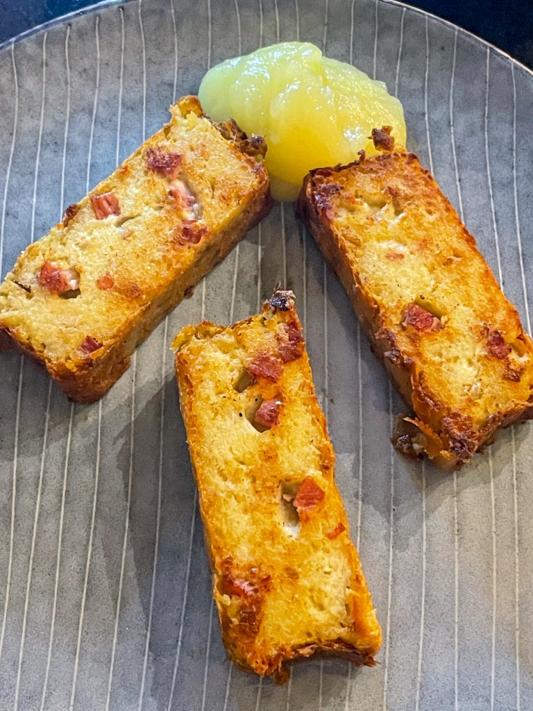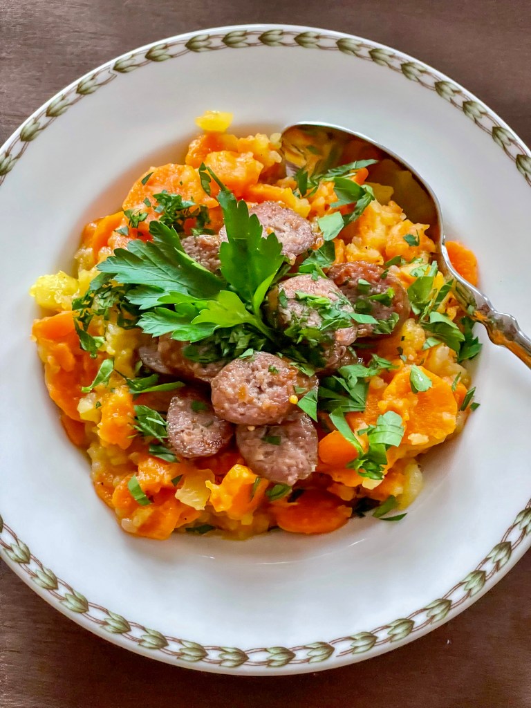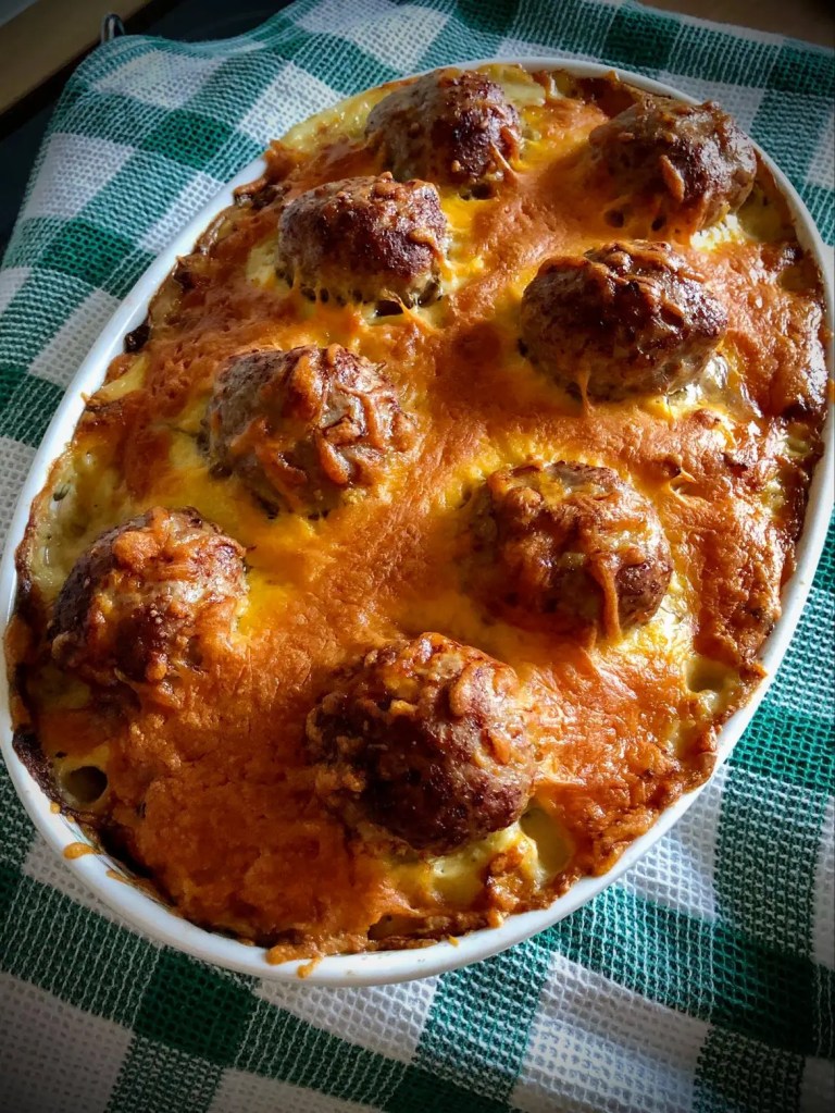 Die Hackbällchen werden aus Bratwurstbrät geformt und liegen auf einem Spitzkohl-Kartoffelbett. Hier war noch viel Käse – eigentlich sollten die Bällchen frei davon bleiben, aber 🧀 geht immer… ☺️