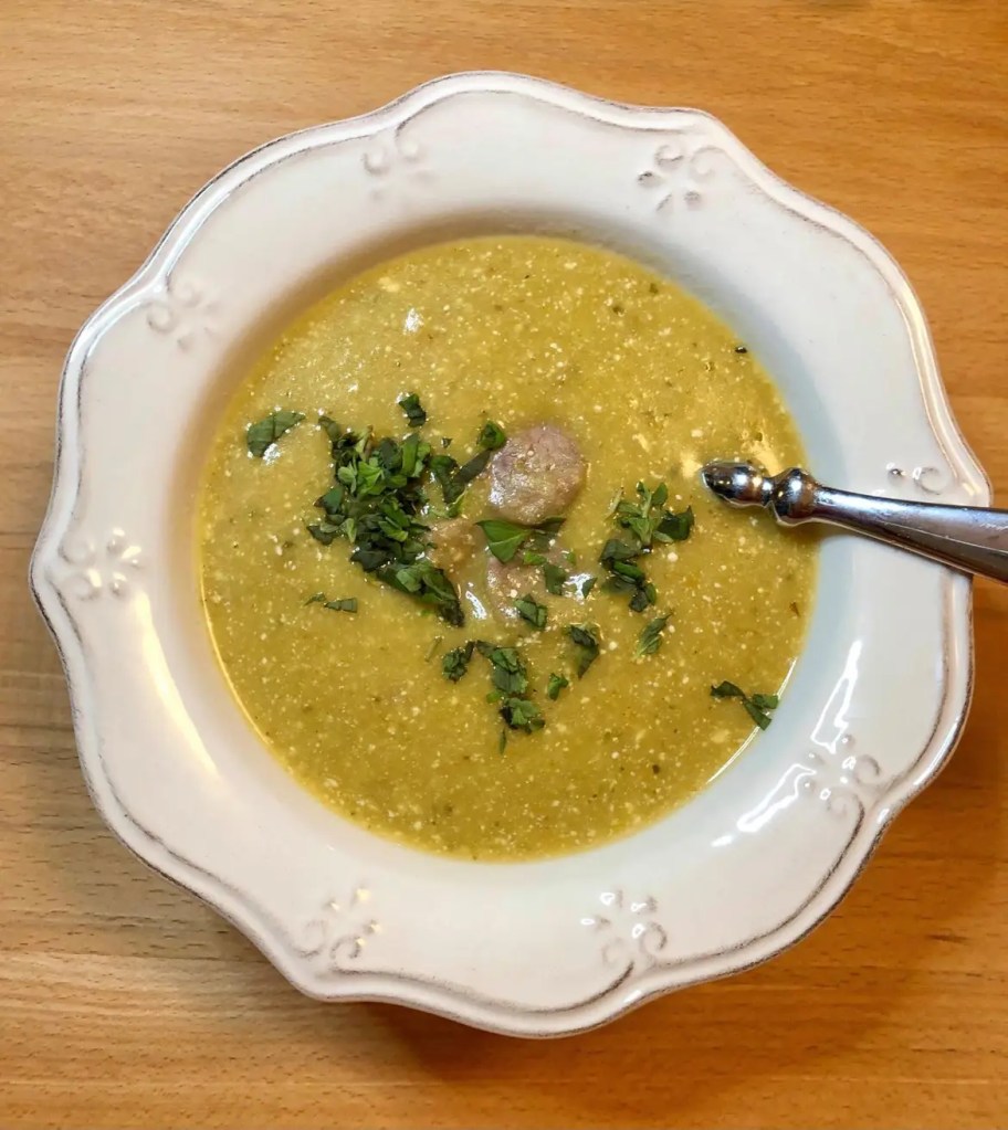 Optisch nicht so ansprechend – mein Fehler… die Saure Sahne ist ausgeflockt, aber die Suppe schmeckte trotzdem sehr gut: mit Kartoffeln, Sellerie, Möhren und Lauch und frischem Majoran. Lecker! 🥔
