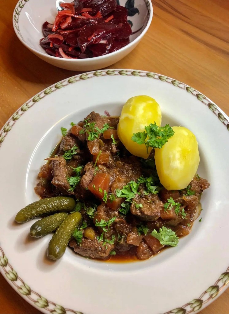 Hier leicht variiert, da ich noch Rote Bete zum Fleisch gegeben habe – schmeckt mir immer sehr gut.