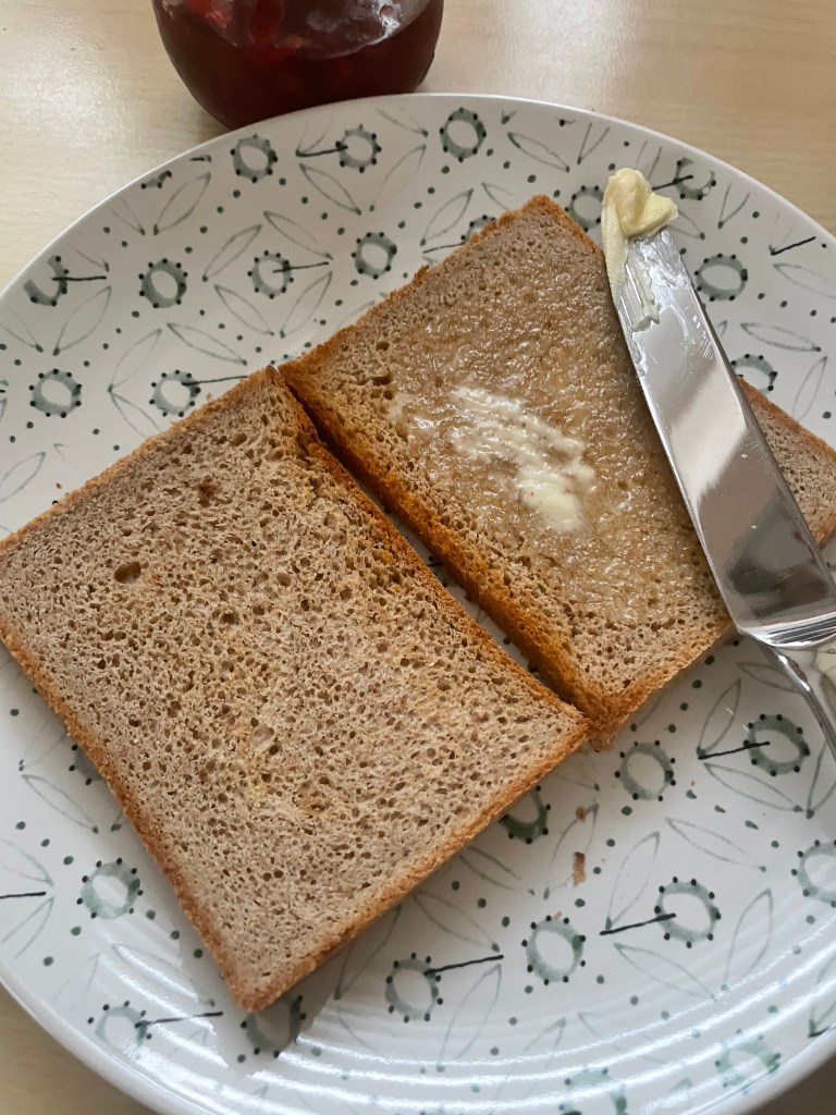 Das Brot ist nach 5,5 Stunden im Ofen. Das ist extrem flott, zumal auch nur 6 g Hefe dazu kommen. Es besteht nur aus drei Komponenten – einem Mehlkochstück, einer Salz-Hefe-Mischung und dem Hauptteig. Es wird fast komplett aus Weizenvollkorn gemacht, der Butteranteil liegt bei nur 30 g. Es ist wirklich schmackhaft – schmeckt mir auch (anders als Industrietoast) ungetoastet.