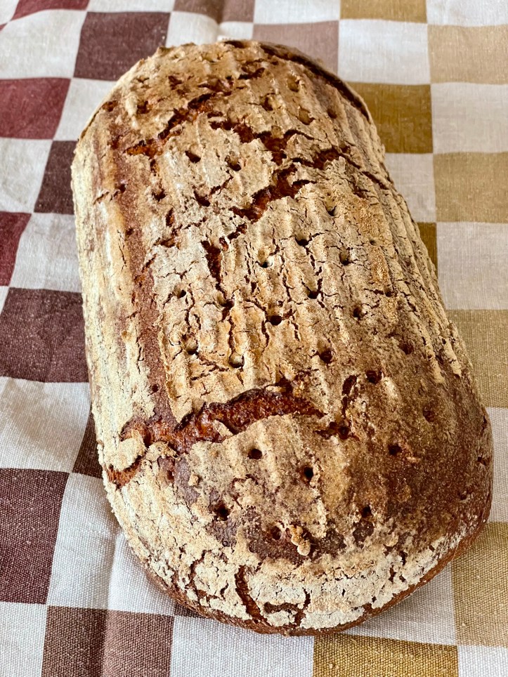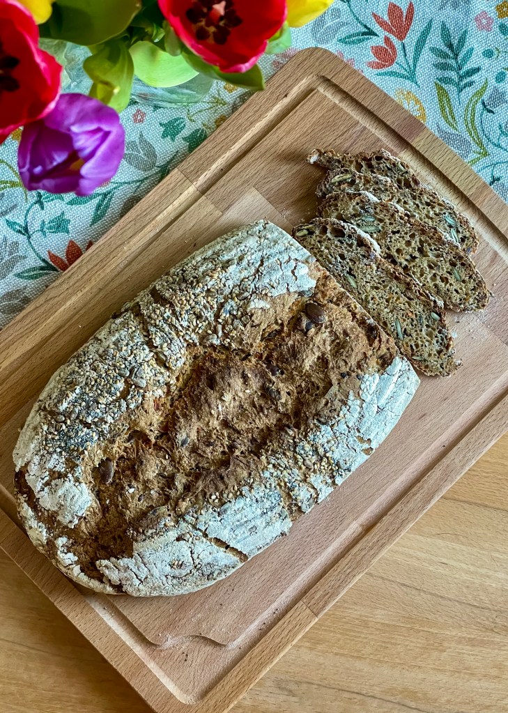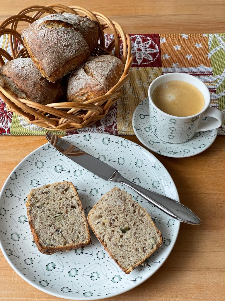 Nomen est omen – ein reines Vollkornbrot mit Roggensauerteig und wenig Hefe, geriebener Möhre und einem Quellstück aus Haferflocken, Leinsamen und Kürbiskernen. Das erste Rezept aus dem Buch, bei dem mir ein kleiner Fehler aufgefallen ist: Es steht nirgendwo, wann man den Sauerteig zum Hauptteig geben soll. Wenn man erfahren ist, weiß man das, aber für Anfänger*innen doof.