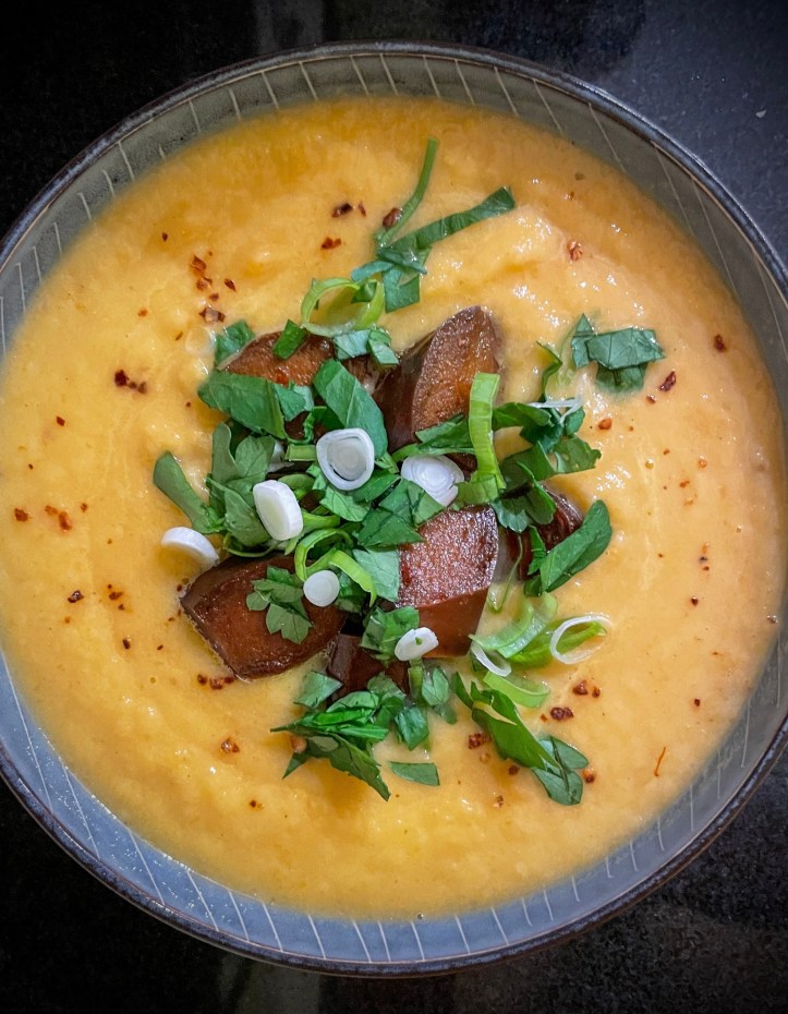 Eine tolle Wintersuppe, die durch einen Apfel und Apfel-Balsamico eine fruchtige Würze bekommt. Die Mettenden habe ich hier durch eine angebratene vegane Chorizo ersetzt – das passte auch wunderbar.