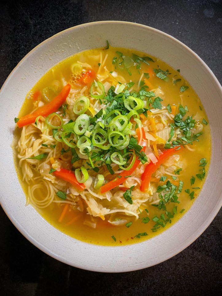 Eine schöne, schnelle und einfache Suppe, die besonderes Aroma durch Kaffirlimettenblätter und helle Misopaste erhält.