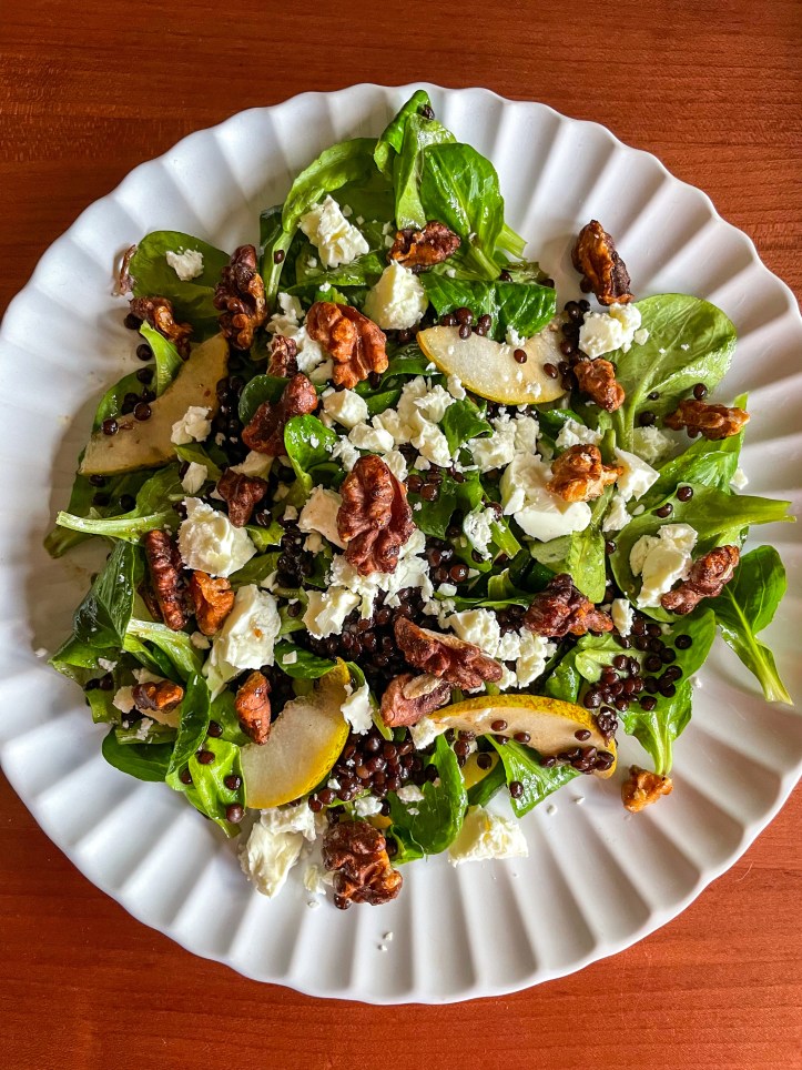 Tolle Kombi aus im Ofen auf einem Salzbett gebackenen Gelben Beten, karamellisierten Walnusskernen (hier Pekannüssen) mit einem Hauch Rauchsalz, roten Zwiebeln, Birnen und Ziegenfrischkäse sowie einer Orangen-Senf-Vinaigrette aus Orangen- und Zitronensaft, Olivenöl, Weißweinessig, Ahornsirup und körnigem Senf.