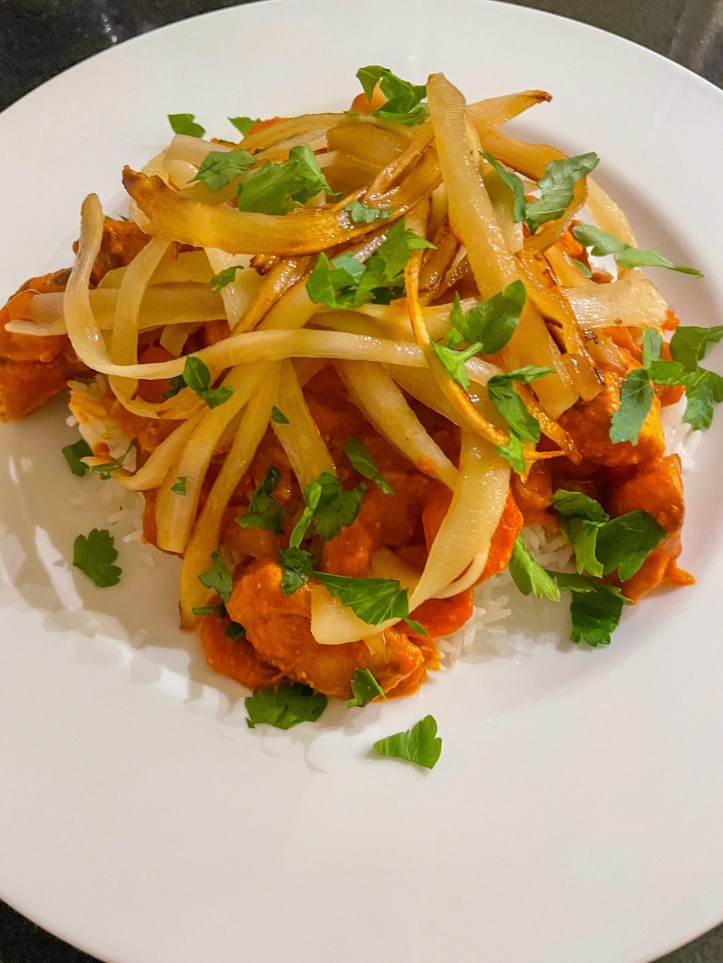 Ein herrliches Butter-Chicken mit Kokos, Tomate und roter Currypaste und on top buttrig-gebratene Schwarzwurzelstreifen… mmmmhhhhmmm…