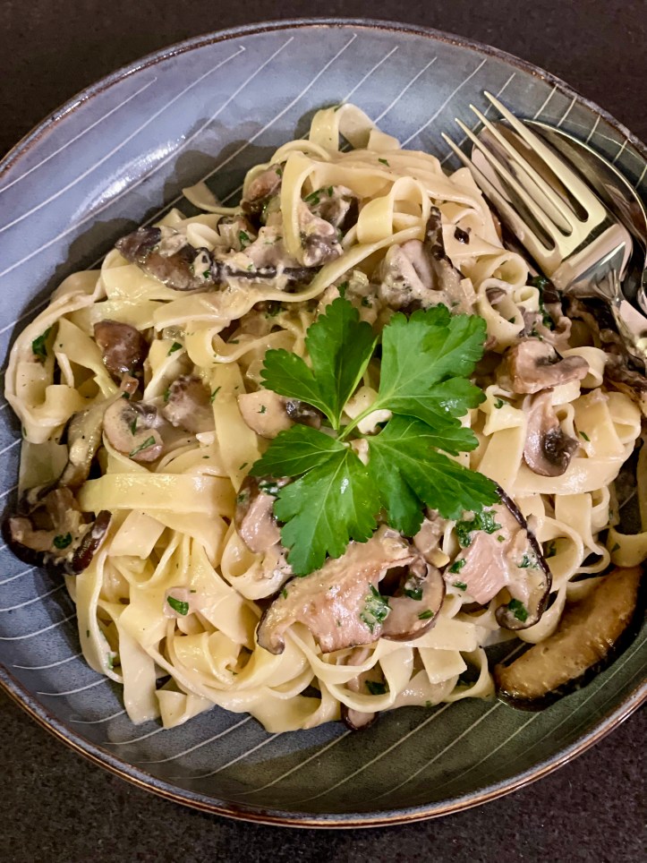 Ein schnelles Feierabend-Essen, das ich so oder so ähnlich häufiger mache: mit Shiitake- und Austernpilzen und Champignons. Hier ist es an das Zürcher Geschnetzelte angelehnt, die Austernpilze sollen das Fleisch vom Mundgefühl her ersetzen. Damit das auch gelingt werden die Pilze portionsweise angebraten, damit sie nicht unnötig Wasser ziehen und schön Farbe bekommen. Immer lecker.