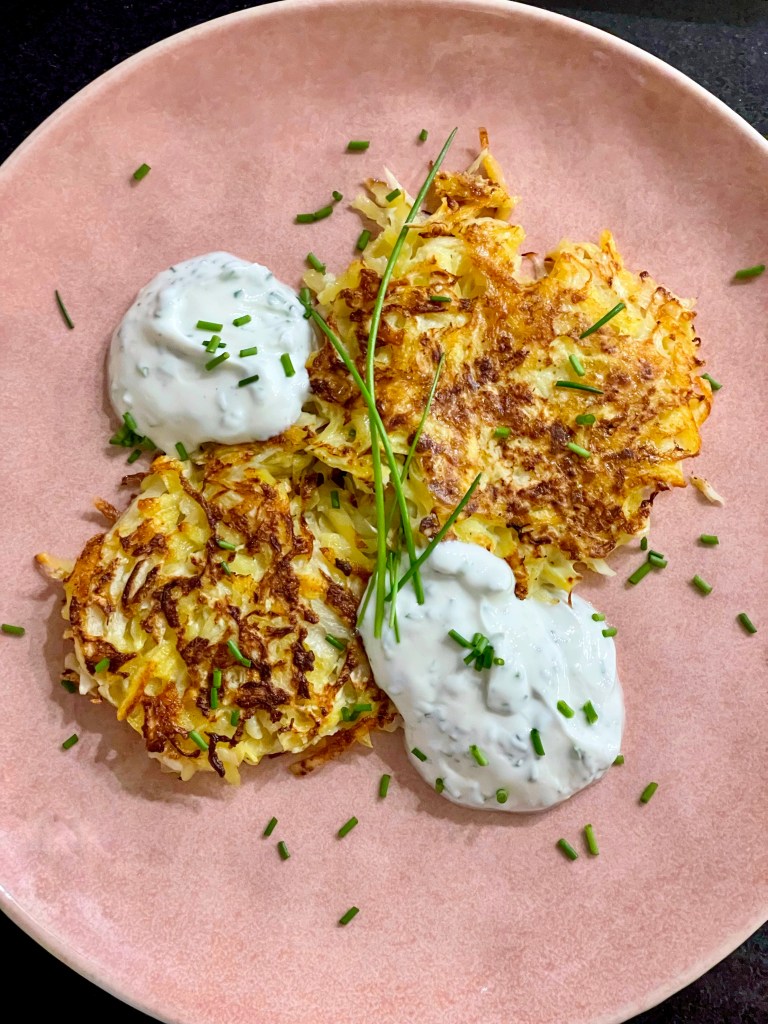 Schnell gemacht zum Feierabend – Schwarzer Rettich und Kartoffeln (zu gleichen Teilen) grob raspeln und mit Eiern, Mehl und Salz vermengen und in der Pfanne braten. Dazu gibt es einen frischen Quark, laut Rezept mit Frühlingszwiebeln – hier habe ich ihn mit Schnittlauch angerührt. Sehr lecker!