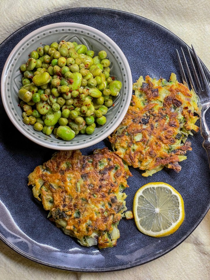 Das war megaköstlich und genau nach meinem Geschmack: richtig gehaltvolle Gemüsepuffer mit Wumms. Letzter kommt Cayennepfeffer hinein und an Gemüse finden sich darin Zucchini, Lauch, Kartoffel, rote Zwiebel, schwarze Oliven und reichlich frischer Koriander, etwas Zitronenschale und Knoblauch. Eier und etwas Mehl sorgen für die Bindung. Sehr gut! Ebenso wie das Erbsen-Bohnen-Gemüse, das mit TK-Ware blitzschnell gemacht ist und dann mit Zitronensaft und -schale, Olivenöl, Chiliflocken und Kreuzkümmel angemacht und warm serviert wird. Tolles Essen; würde ich auch Nicht-Vegetariern vorsetzen, ich denke, das überzeugt jeden davon, dass Gemüseküche nicht langweilig sein muss.