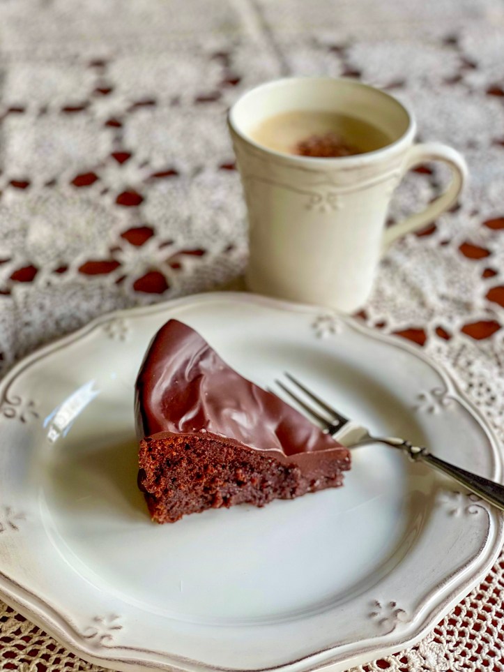 Der Kuchen ist mehl- und damit glutenfrei. Es kommen nur wenig gemahlene Mandeln hinein. Viel Schokolade, vier Eier (auf eine 22cm Form) und Zucker dazu, damit bleibt er sehr feucht und saftig und nach dem Backen kommt dann erst noch etwas Portwein darüber und dann eine Schokocreme als Decke darauf, wieder aus viel Schokolade und Sahne und etwas Butter.