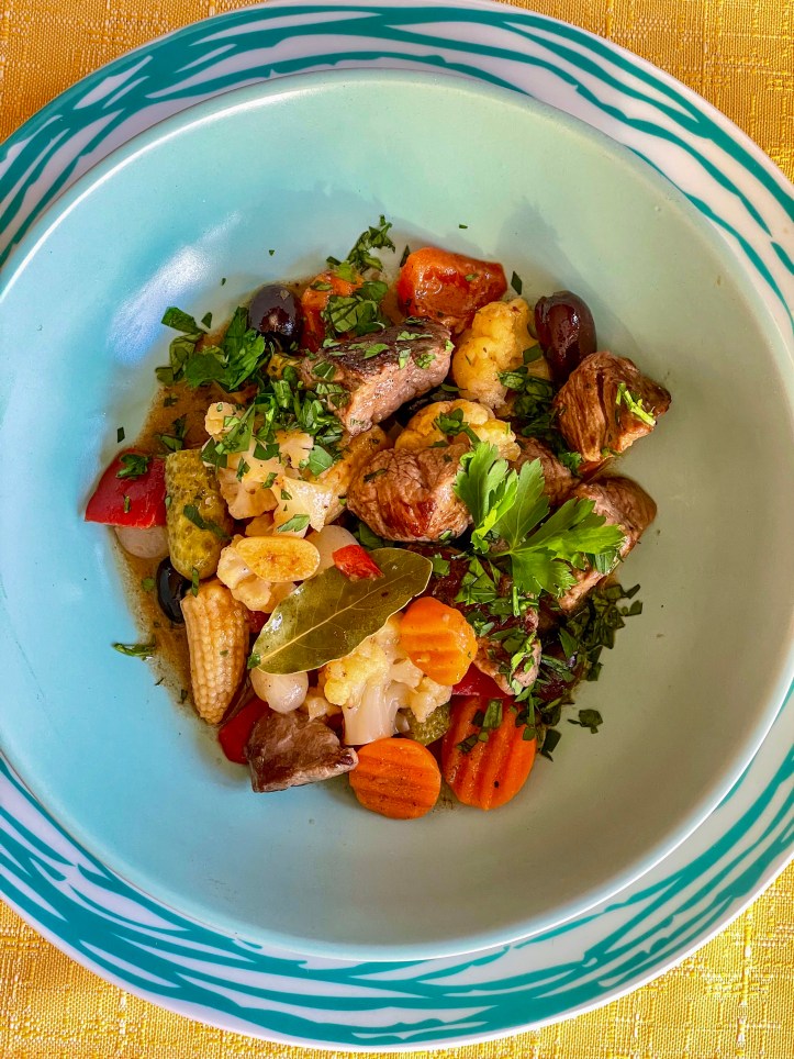 Es darf „gepickt“ werden (pica pau heißt Specht) – Hüftsteak wird angebraten, Knoblauch dazu und dann wird der Bratensatz mit Weißwein losgekocht und mit Dijon Senf und Worcestershire Sauce gewürzt. Etwas kalte Butter für die Bindung dazu geben, dann Mixed Pickles und Oliven so wie schwarze Oliven unterheben. Sehr einfach und sehr lecker.