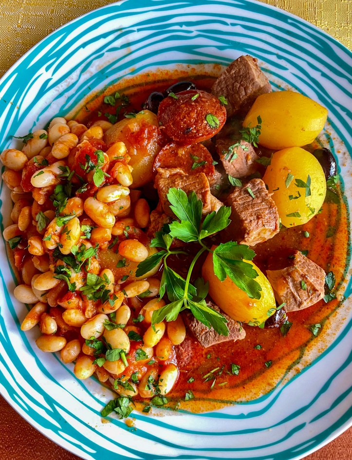 Im Rezept wird Schweine- oder Rindergulasch verwendet, hier gab es nur letzteren und dazu Chourizo in dünne Scheiben geschnitten. Schwarze Bohnen, Tomatenstücke (aus der Dose), Lorbeer, Pfeffer und etwas Pimentón de la Vera – mehr braucht es nicht, um dieses sehr schmackhafte Eintopfgericht zu kochen.