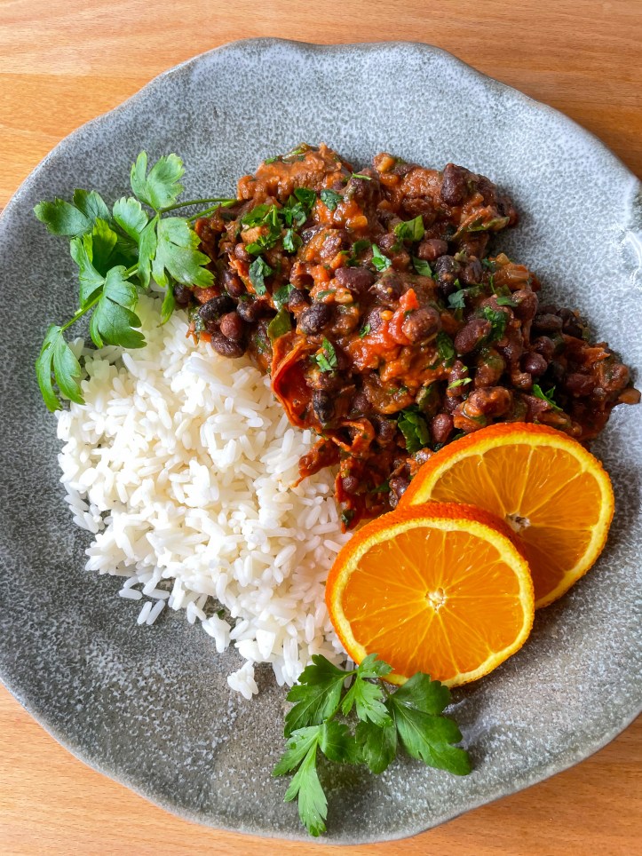 Die Zeit auf dem Herd war hier länger als die angegebenen 45-60 Minuten, aber das war sicherlich auch dem Rindergulasch geschuldet. Ich habe es am Vorabend vorgekocht und es schmeckte am nächsten Tag auch noch besser, wie immer bei dieser Art von Gericht. Vor dem Servieren wird noch reichlich frische Petersilie untergehoben und auf den Teller kommen noch Reis und Orangenscheiben oder -spalten.