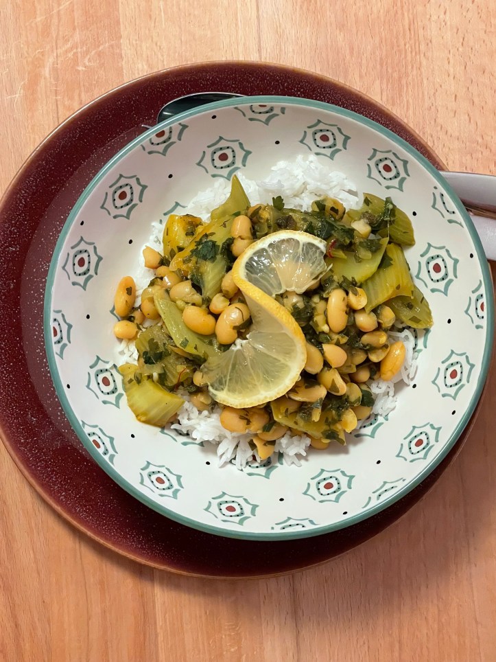 Jetzt erst die Bohnen (aus der Dose mit der Flüssigkeit) und jede Menge gehackte Petersilie einrühren und noch einmal 10 Minuten kochen lassen, dann frisch gehackte Minze unterrühren und noch einmal 5 Minuten in Ruhe lassen. Erst jetzt kommen Safran und Zitronensaft dazu und etwas Wasser und alles darf noch einmal gute 20 Minuten einkochen. Dann sollte Eintopf etwas eingedickt sein und der Staudensellerie fast weich. Das Ergebnis ist ein köstlicher Eintopf mit einem Staudensellerie, der ein Aroma entwickelt hat „irgendwo zwischen Staudensellerie, Schalotten und Fenchel“ (so Sodha) und fantastisch schmeckt. Und ich behaupte: auch Menschen, die sonst mit dem strengen Geschmack ein Problem haben – hier kommt er samtweich daher.