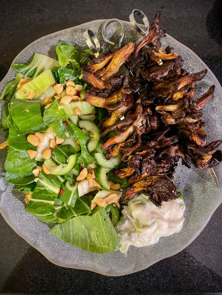 Austernpilze am Spieß sind immer toll – und mit der Marinade, die hier an sie kommt, werden sie ganz wunderbar würzig. Sie besteht aus Rapsöl, Honig, Sojasauce, reichlich Knoblauch und Ingwer und Salz. Laut Rezept werden sie 20 Minuten im Backofen gebacken, hier im Airfryer hat es nur gut 10 Minuten gedauert.