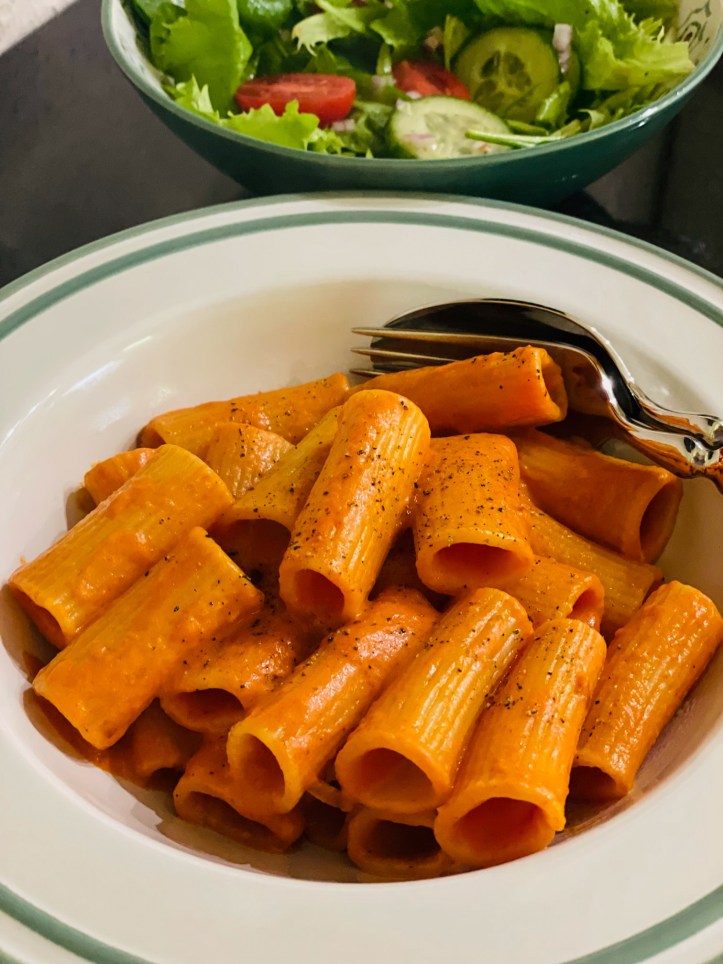 Rote Zwiebel wird langsam mit Salz weich geschmort, dann darf Knoblauch eine Weil mitschmörgeln, bevor Tomaten-Passata, Tomatenmark, Gochujang Paste und Wodka dazukommen. Das darf dann gute 10 Minuten einkochen, bis es dicklich-cremige Konsistenz hat. Danach kommt Sahne und noch einmal Wodka dazu und es darf erneut etwas einkochen. Inzwischen kochen die Rigatoni nicht ganz gar – etwas Kochwasser abnehmen und die Pasta zur Sauce geben, das Wasser zugießen und so lange einkochen lassen bis die Sauce sich schön mit den Nudeln verbunden hat und eingedickt ist. Mit grobem Pfeffer bestreut servieren.