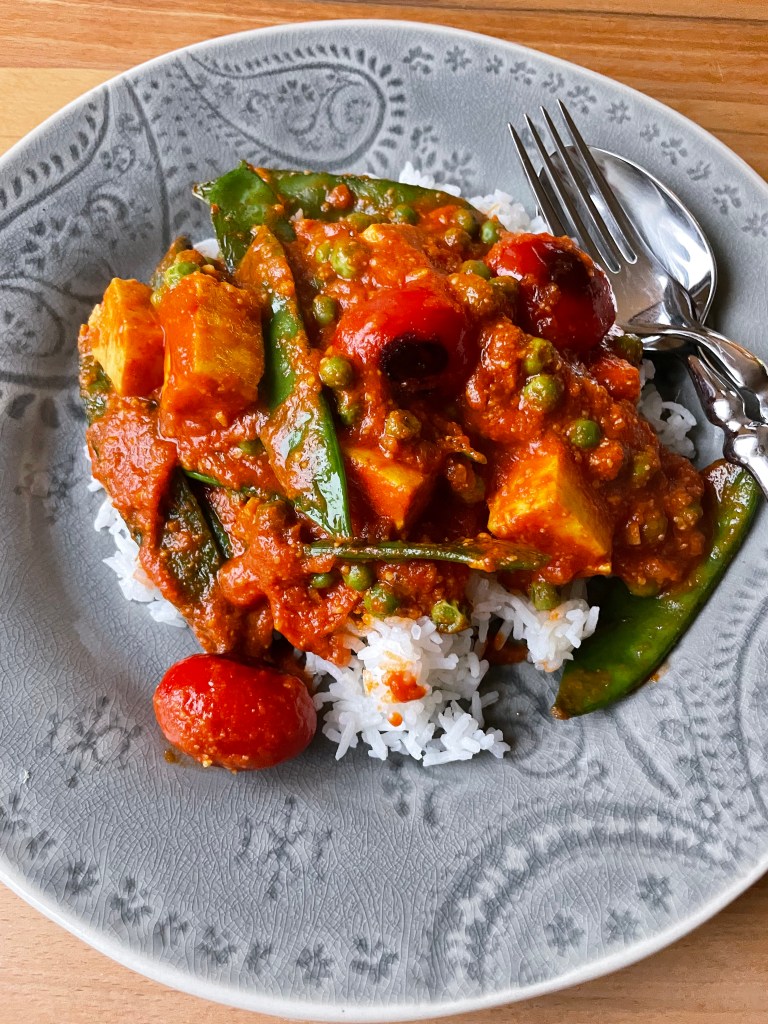 Mal endlich ein indischer Klassiker aus diesem Buch. 🙂 Das Curry mit Paneer, Tomaten und Erbsen erhält hier noch zusätzlichen Biss durch Zuckerschoten und ganze Cherrytomaten. Beide Zutaten werden vorab scharf angebraten und kommen dann erst wieder zum Schluss ins Curry. Auch zusätzlich kommt eine Cashewpaste zum Schluss dazu, die ein schöne Cremigkeit gibt und für Milde sorgt. Richtig scharf ist es sowieso nicht, denn es kommt Kashmiri Chilipulver dazu und Kreuzkümmel, Koriander und Kurkuma.