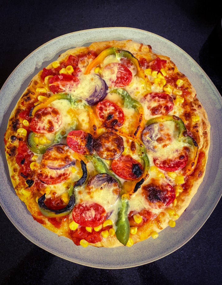 Die goldene Meile ist ein anderer Name für die Belgrave Road in Leicester. In den zahlreichen indischen Restaurants dort hat Meera Sodha in ihrer Jugend öfter diese Pizza mit indischem Einschlag gegessen. Schon in die Tomatensauce kommt Kashmiri Chili und Knoblauch sowie etwas Tomatenketchup, was aber gut harmonierte. Belegt wird mit Mozzarella, Cherrytomaten, Mais, roter Zwiebel und grüner Paprika. Nach dem Backen wird noch ein Öl mit Chaat masala und grüner Chili über die fertige Pizza gegeben. Yummie! 🤤