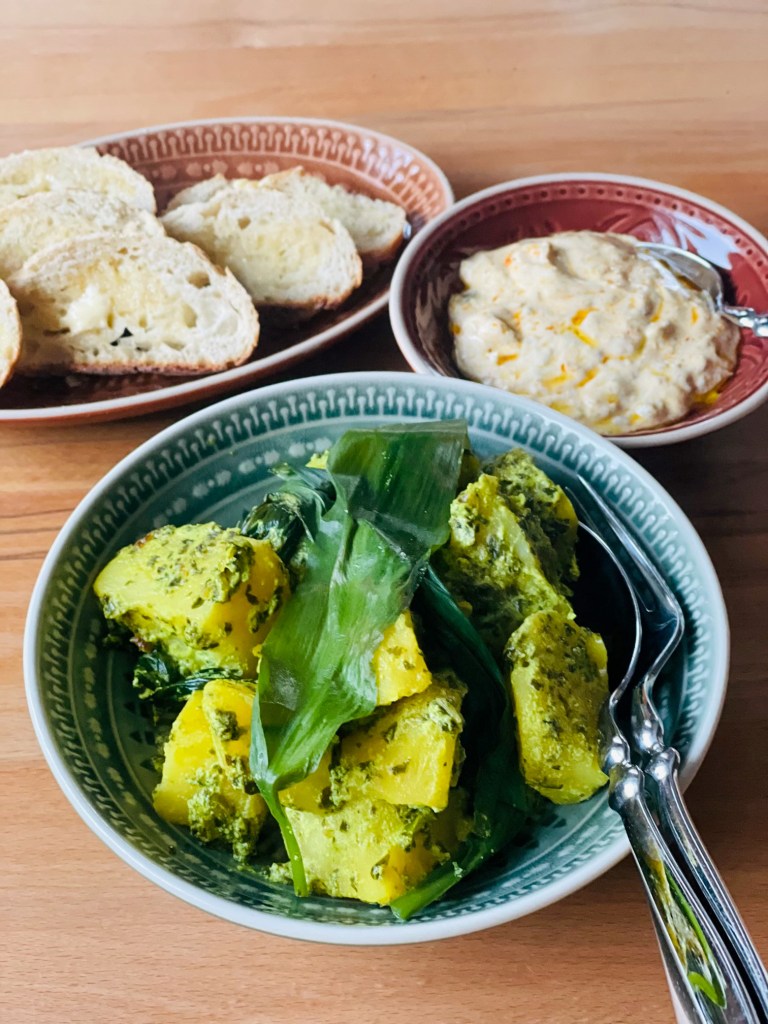 Die Kartoffeln werden vorgekocht, währenddessen schmörgeln Zwiebeln langsam an und man mixt den größten Teil des Bärlauchs mit Rahmjoghurt auf. Zu den Zwiebeln kommen dann noch Ingwer, grüne Chili sowie Kreuzkümmel und Kurkuma und schließlich die Kartoffeln. Dann darf der Bärlauchjoghurt dazu und alles köchelt etwas ein, zu Schluss wird der restliche Bärlauch dazugegeben und darf noch zusammenfallen bevor serviert wird. Dazu wird ein Joghurt gereicht, in den Lime Pickle (ich hatte das von Pataks, das war in Ordnung) eingerührt wird (die Limettenstücke vorher fein schneiden) und eigentlich Naan-Brot, das dick mit Butter bestrichen werden soll. Hier gab es ein übrig gebliebenes Kartoffelbrötchen dazu.