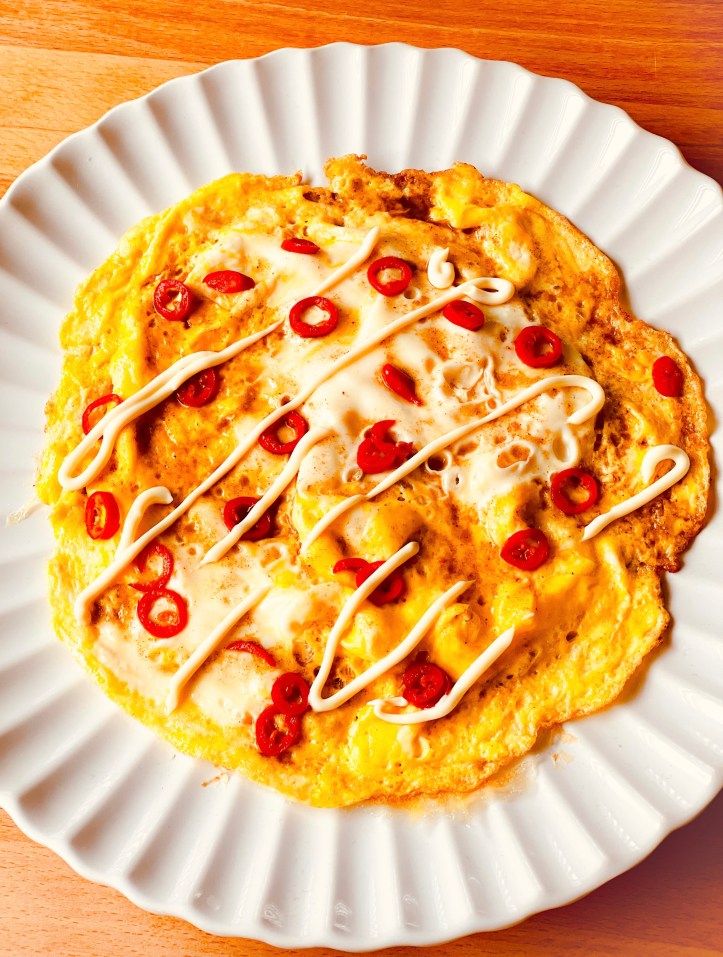 Ein ganz einfaches, blitzschnell fertiges Eiergericht, das man auch mit Reis servieren kann. Auch ohne schmeckt es wunderbar nährend – für zwei Portionen werden immerhin 8 Eier verarbeitet. Sie werden mit (vegetarischer) Fischsauce und Salz gewürzt und vor dem Servieren kommt noch die thailändische Nam-Pla-Sauce aus Bird‘s Eye Chili, Limettensaft und Fischsauce dazu und Kewpie-Mayonnaise. Wirklich einfach gut!