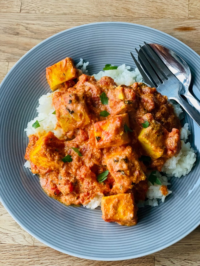 Die Vielfalt der Kombinationen und die daraus entstehenden ganz unterschiedlichen Aromen faszinieren mich gerade an der indischen Küche ganz besonders. Hier wird mit Bockshornkleesaat, Schwarzer Senfsaat, Kreuzkümmel, Koriander, Kurkuma und Kashmiri Chilipulver gewürzt und reichlich Knoblauch, Zwiebel und Tomaten kommen neben den im Titel genannten Zutaten noch dazu. Serviert wird mit frischem Koriander und einem Klecks Joghurt – das passt wunderbar.