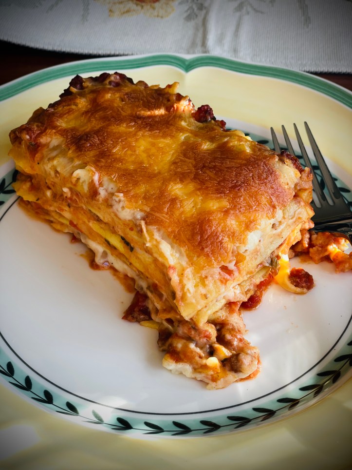 Ein Klassiker – geht eigentlich auch ohne Rezept, zumal ich „meine“ Bolognese genauso wie in diesem Rezept mache: mit Sellerie, Karotte, Lauch, Zwiebel, Knoblauch, Tomaten und mit Rinderhack. Gewürzt wird mit Basilikum, Rosmarin, Thymian und Oregano. Aber auch in diesem Rezept finden sich Fehler. Dabei sind Druckfehler wie „für 4 Pportionen“ zu vernachlässigen, aber bei einer Béchamelsauce in die auf 650 ml Milch 250 Gramm Butter und 200 Gramm Mehl kommen sollen, bin ich doch vorsichtshalber abgebogen und habe Butter und Mehl zumindest halbiert und die Flüssigkeitsmenge belassen, was bereits eine sehr dicke, aber noch streichfähige Sauce ergeben hat. Wahrscheinlich wäre es mit einem Streichen der jeweiligen 0 auch noch besser gegangen. Etwas ungewöhnlich, aber sicherlich eine richtige Rezeptangabe: in der Butter für die Béchamel werden noch Zwiebeln mit angeschwitzt.