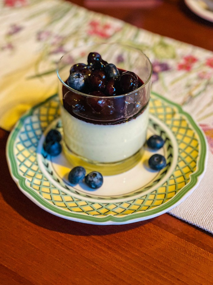 Die Panna Cotta wird aus Sahne und Saft und Abrieb jeweils einer Zitrone und einer Orange gemacht und mit Vanille, Zimt und Sternanis und später noch etwas Grand Marnier aromatisiert. Auch hier hat sich ein Fehler eingeschlichen – was mit dem Abrieb passieren soll, steht nicht in der Zubereitung.
