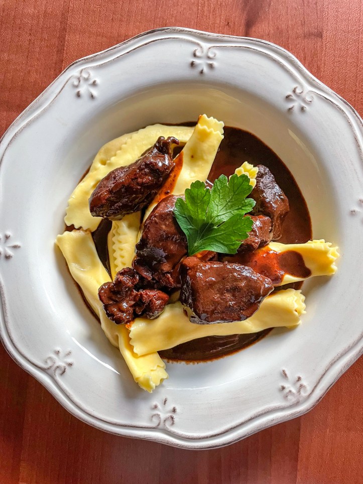 Besonders ist bei Rezepten, dass manche Angaben stimmig erscheinen und andere dann so völlig schräg. 🤷♀️ In die Sauce kommen Wurzelgemüse, Tomatenmark, Madeira, Port- und Rotwein sowie Wildfond und neben der Gewürzmischung noch Chili, Zimt und Bitterkuvertüre. Alles darf sehr lange im Backofen schmoren und dann darf das Fleisch nach dem Durchseihen und Aussortieren der Gemüse noch in der Sauce schmörgeln, bis es ganz zart ist und der Sugo sämig eingekocht. Ein toller Geschmack am Ende! Harmonierte prächtig mit der Pasta.
