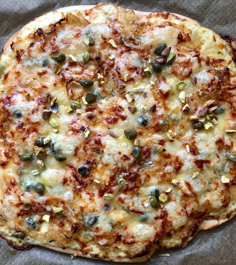 Bergkäse darauf und nach dem Backen noch ein paar Kapern und gehackte Pistazien dazu und es ist perfekt! 🧅 🤤