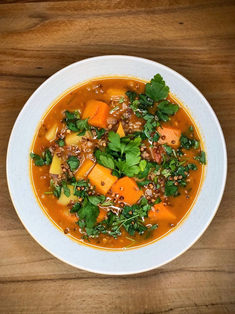 Butternut, Kartoffeln, Tomaten kochen mit Buchweizen in Brühe und Kokosmilch und gewürzt wird mit Kokos-Curry, Kümmel, Petersilie und Zitrone.