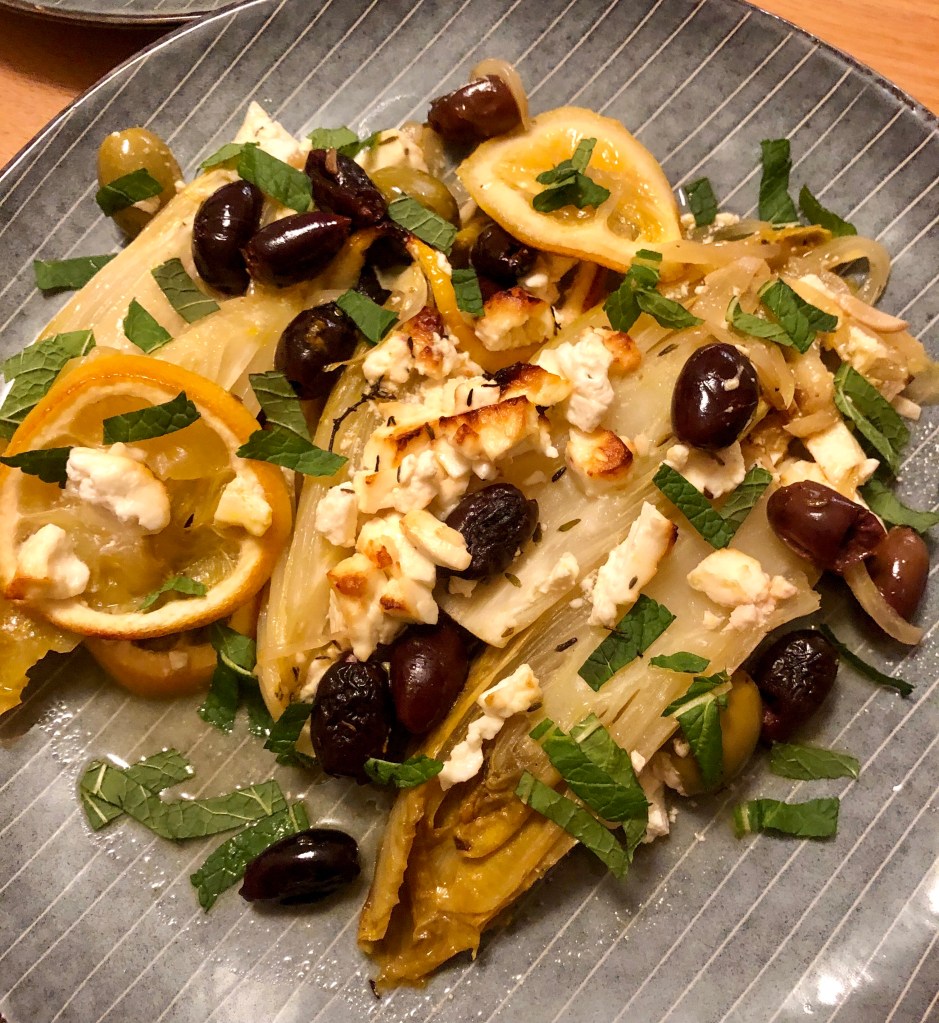 Mit Zwiebeln und Knoblauch, Orangensaft, etwas Brühe und Thymian. Dazu Zitronenscheiben, Oliven und Feta und am Ende etwas Minze darüber.
