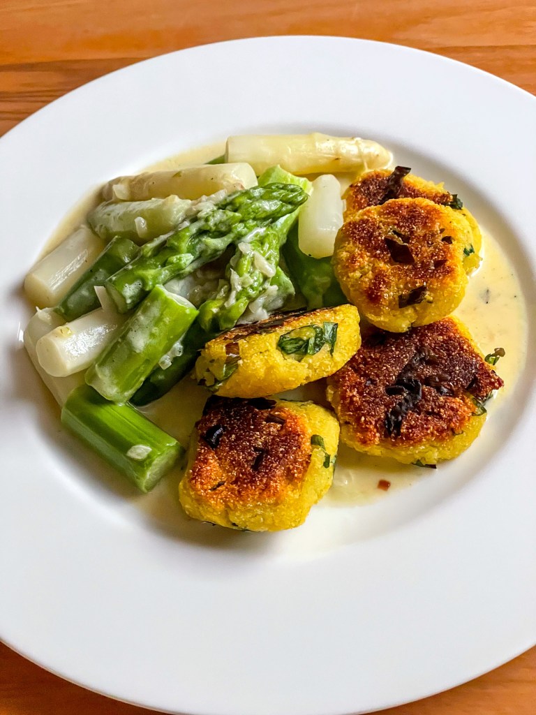 Ein einfaches veganes Rezept, aber mal was anderes: in die Taler kommen gepresste Kartoffeln und Maisgrieß und Bärlauch. Daraus werden die Taler geformt und dann in Kokosöl (hier Olivenöl) gebraten. Für das Spargelragout werden die Stangen kurz bissfest vorgegart, dabei wird etwas Spargelwasser aufgefangen. Eine Zwiebel in Olivenöl anbraten, mit Mehl bestäuben und ein Gemisch aus Spargelwasser und (Hafer-)Sahne angießen. Leicht einköcheln lassen, Spargel zugeben, mit Zitrone, Salz und Pfeffer abschmecken – fertig. Einfach gut!