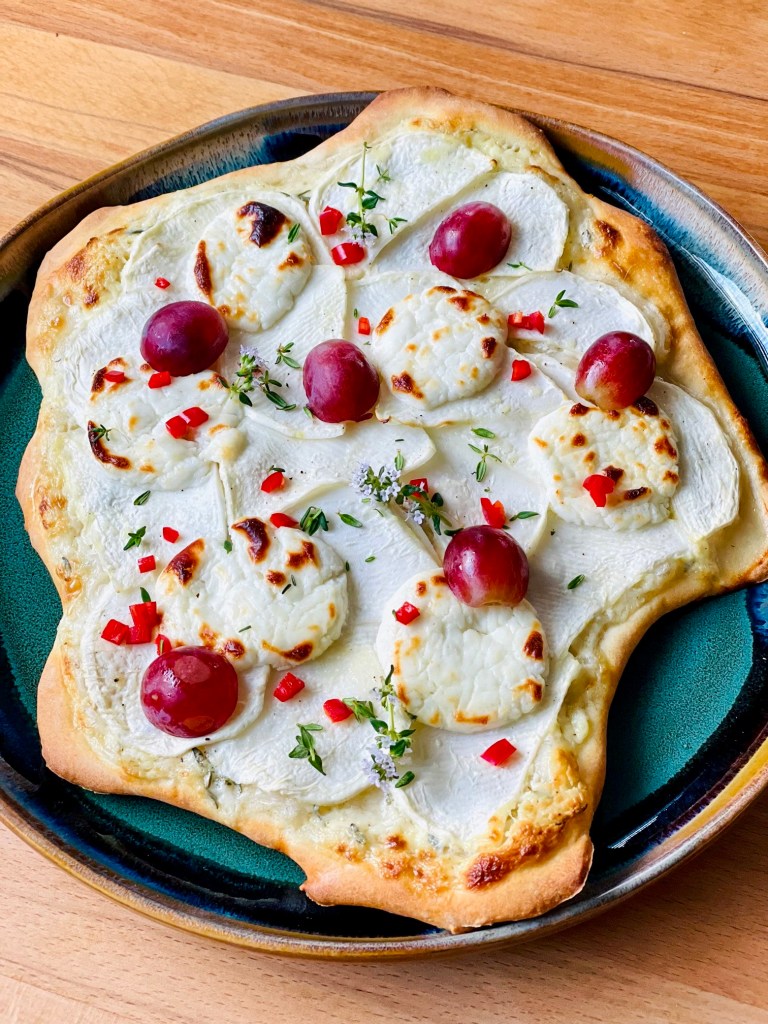 Für den Belag wird Crème fraîche mit frischem Thymian verrührt und die Mairübchen fein gehobelt und in einer Mischung aus Zitronensaft, Olivenöl, süßem Senf und Salz/Pfeffer mariniert. Vor dem Backen kommt noch Ziegenfrischkäse on top und nach dem Backen werden noch Weintrauben und Chilistückchen darauf verteilt – und noch einmal Thymian. Den konnte es gut gebrauchen, da die Mairüben ja nicht sooo viel Eigengeschmack mitbringen.