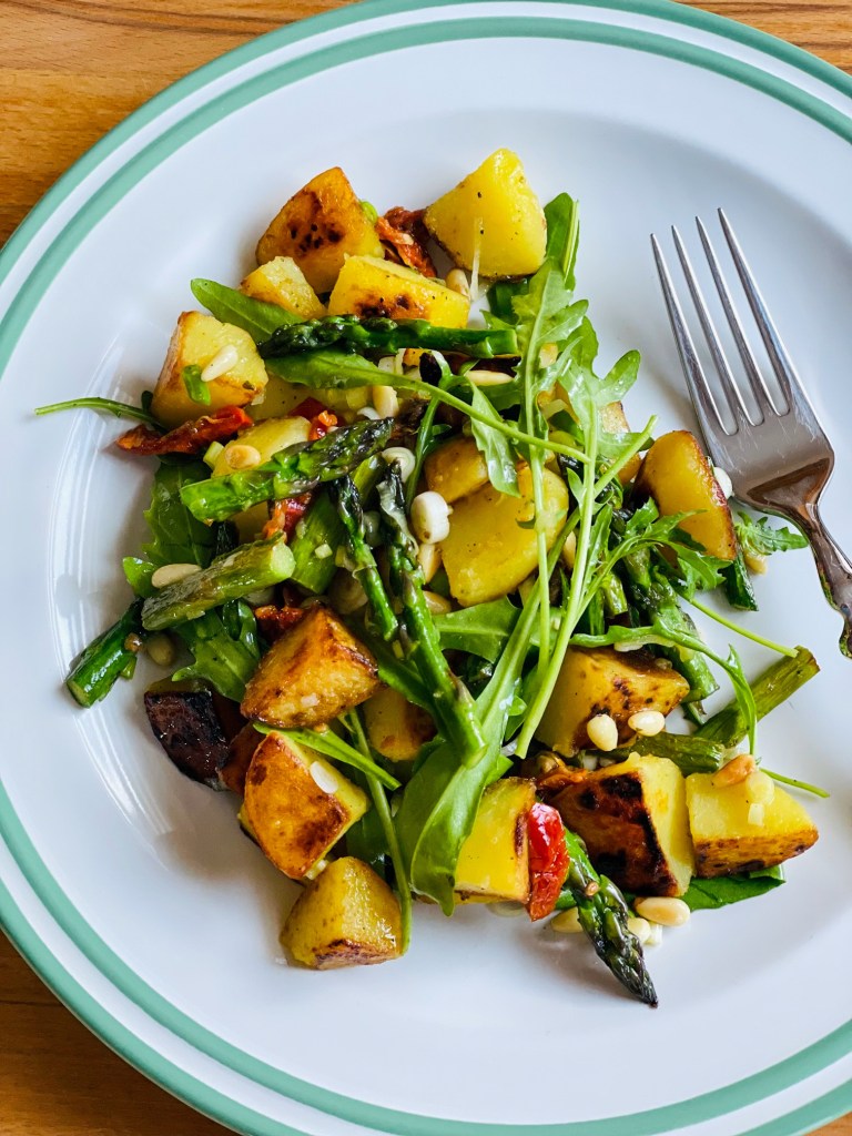 sind in Wirklichkeit ein wunderbarer lauwarmer Kartoffel-Spargel-Salat, zufällig vegan zudem. Beides wird gebraten, die gewürfelten Kartoffeln vorher gekocht. Dazu kommen noch getrocknete Tomaten, Rucola, Frühlingszwiebeln und Pinienkerne und ein einfaches, aber köstliches Dressing aus Walnussöl, Weißweinessig, Senf und Ahornsirup. So köstlich! Perfekt!