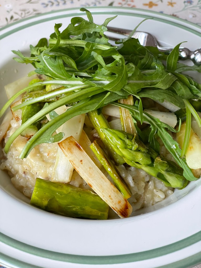 Der Spargel bekommt ebenfalls Säure von der Zitrone, wird aber ansonsten nur mit Salz im Olivenöl geschmort. Vor dem Servieren noch etwas Rucola on top – und fertig ist die perfekte Kombi. Das war wirklich richtig gut.