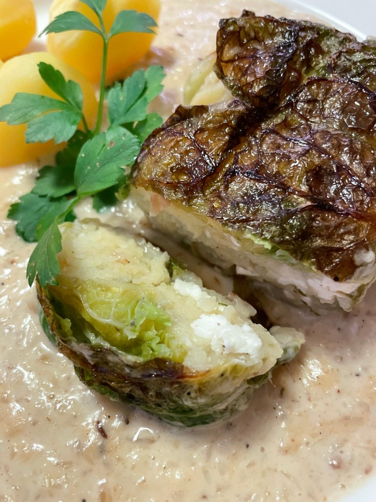 Die Beigaben variieren und auch für die Herstellung gibt es zwei Varianten – entweder arbeitet er mit selbstgemachtem Kloßteig oder mit gekauftem (wie ich hier auch) und je nachdem werden auch erst Serviettenknödel daraus gemacht oder im Falle des gekauften, gleich alles zusammengerührt für die Füllung.