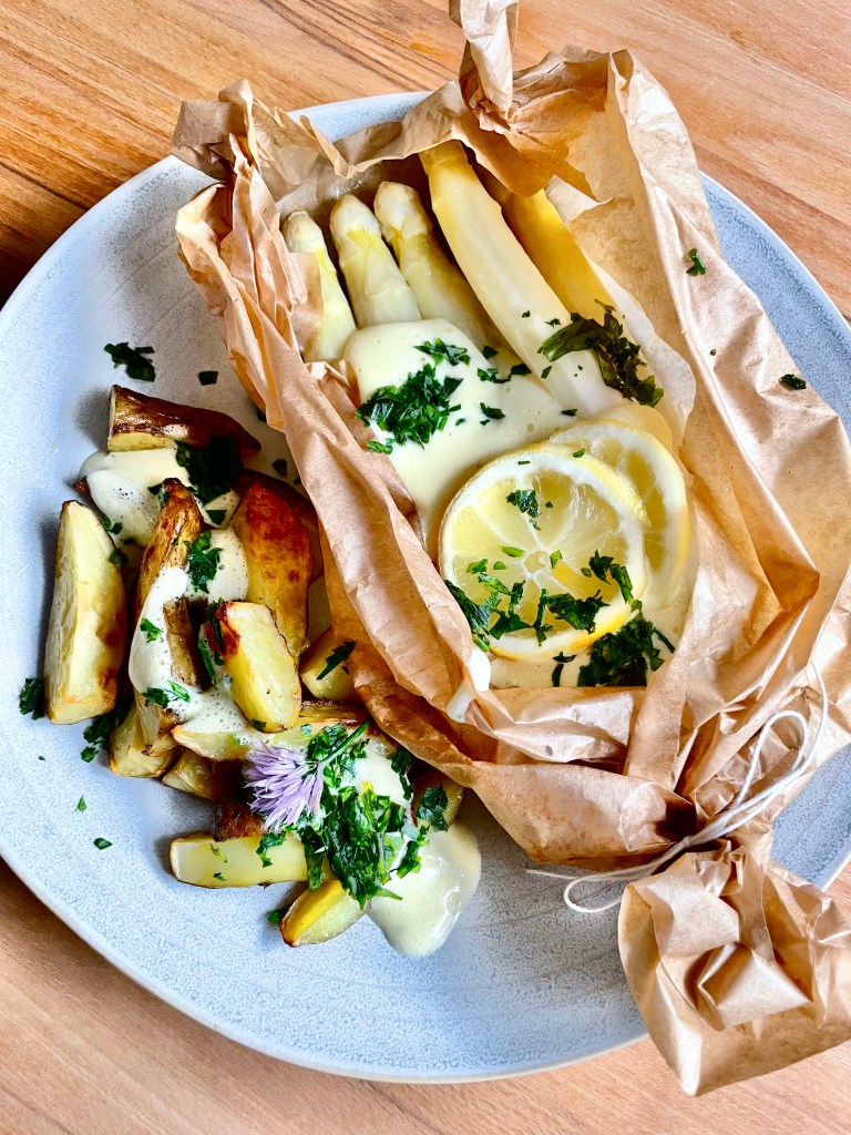 Spargel aus dem Pergament im Ofen gebacken ist immer herrlich aromatisch – hier wird er noch Zitrone aromatisiert und ansonsten kommen nur etwas Olivenöl, Butter und Salz dazu. Die neuen Kartoffel werden ebenfalls ganz puristisch nur mit Olivenöl und Salz im Ofen gebacken. Dazu kommt eine Zabaione aus Eigelb, Weißwein, Balsamico bianco, Estragon und Salz. Der Thermomix hat hier das Schlagen übernommen, deswegen war die gesamte Zubereitung ganz easy und das Ergebnis fantastisch. Am Ende kommt noch eine frische Kräutermischung über das Gericht aus Estragon, Basilikum, Petersilie und Schnittlauch. So schmeckt der Frühling. 🌿😋