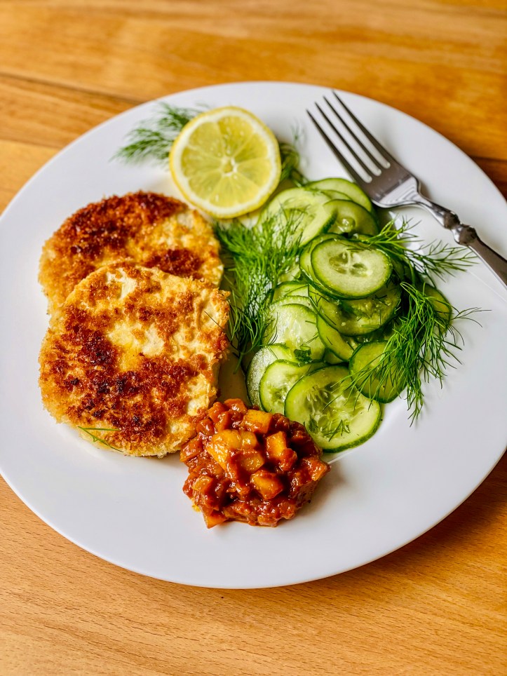 auch extrem gut geschmeckt und so musste ich auf den benannten Ersatz, Dill, ausweichen.Die Selleriescheiben werden mit Salz eingerieben und dürfen dann zum Wasser ziehen kurz ruhen, bevor sie über die Panierstraße in die Pfanne wandern. Sie waren herrlich kross und würzig und ein Spritzer Zitronensaft hat ihnen noch einmal extra Wumms gegeben. Sehr lecker!