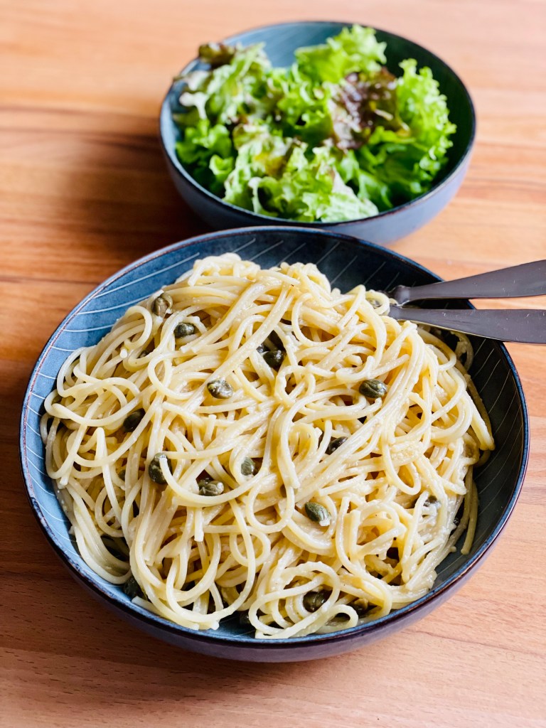In Salz eingelegte Kapern waschen und zerdrücken (mir ist das nicht wirklich gelungen, man quetscht sie eher so an) und mit Olivenöl, Zitronensaft und -abrieb vermengen. Zu den tropfnassen Spaghetti wieder mit in den Topf geben und reichlich (! – 50 g pro Person) geriebenen Parmesan dazugeben, so wie Pfeffer. Serviert wird dazu ein grüner Salat mit einem Honig-Senf-Dressing. Wunderbares Comfort Food, das einem einen Hauch von bella Italia nach einem stressigen Arbeitstag blitzschnell in die Küche zaubert. Molto bene!
