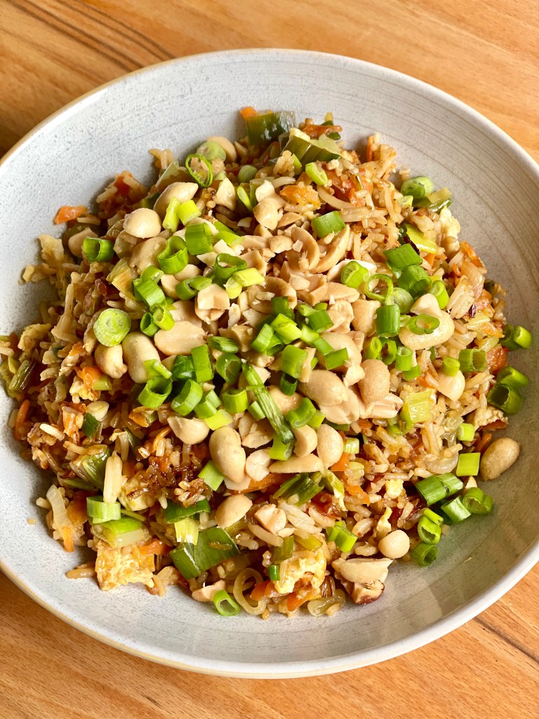 Hier war es die perfekte Resteverwertung für ein Stück Lauch, Möhren und einem Rest von einem Bund Frühlingszwiebeln. Der Reis wird separat angebraten und erst dann zum Gemüse in den Wok gegeben. Eier kommen auch auch noch hinein und Limettensaft sowie Sojasauce, etwas Chili und am Ende: Erdnüsse on top. Sehr lecker und ganz easy!