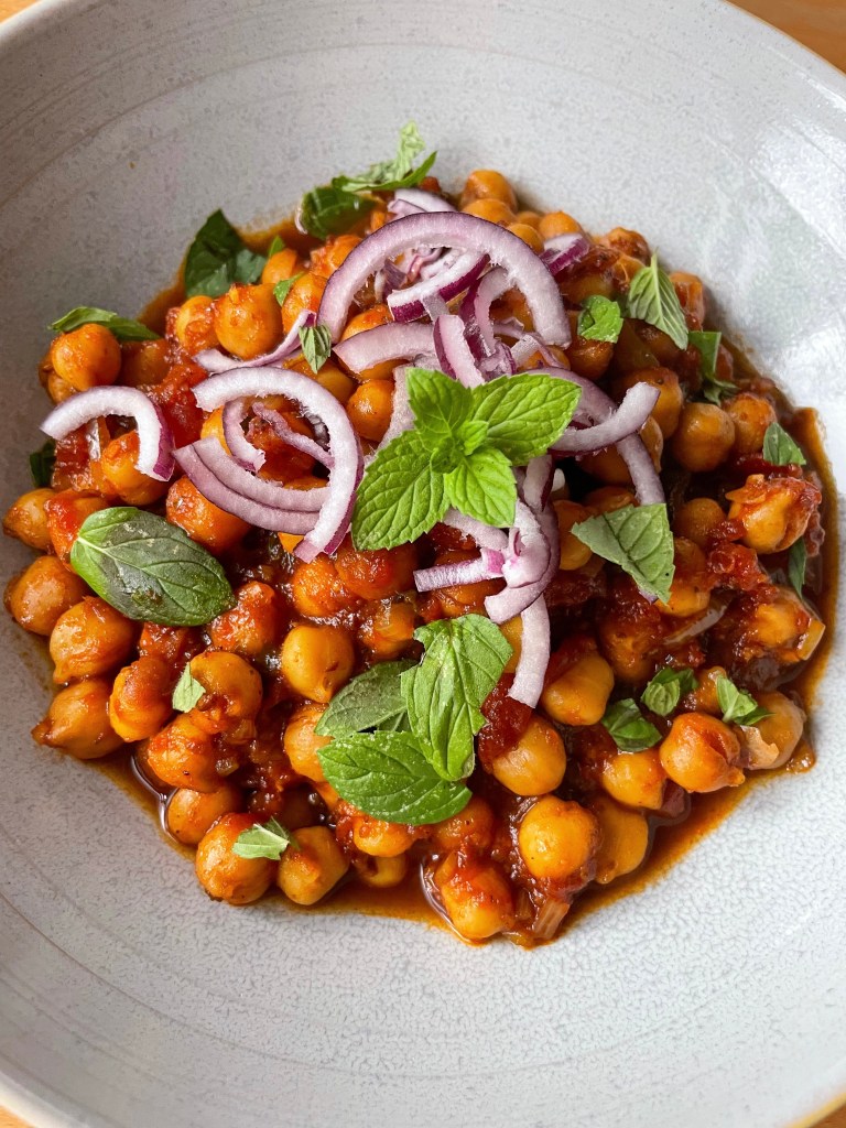 Die Kichererbsen werden darin mit Schalotten, viel Knoblauch und Ingwer angebraten und dann dürfen noch Tomaten, recht viel brauner Zucker und Salz mit hinzu. Die Süße wird wieder ausgeglichen durch ein Püree aus reichlich frischer Minze und und Tamarindenpaste, das nach der Hälfte der Kochzeit noch dazugegeben wird. Am Ende wird noch mit Zitronensaft abgeschmeckt und eine rote Zwiebel kommt frisch obenauf dazu— das passte perfekt. Das war soooo lecker!