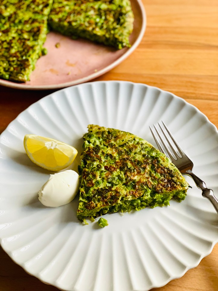 Ganz viel Gemüse und Kräuter sind darin: Erbsen, Zucchini, Zwiebel, Lauch, Petersilie, Minze und gewürzt wird mit noch mehr getrockneter Minze, Aleppo Chili, Kurkuma und Dillsaat sowie Salz und Pfeffer. Es kommen nur drei Eier dazu und eigentlich noch Mehl – das hatte ich vergessen, aber es hat auch nicht gefehlt. Am Ende kommt noch etwas Zitronensaft darüber und serviert wird mit einem Klecks Sauerrahm.