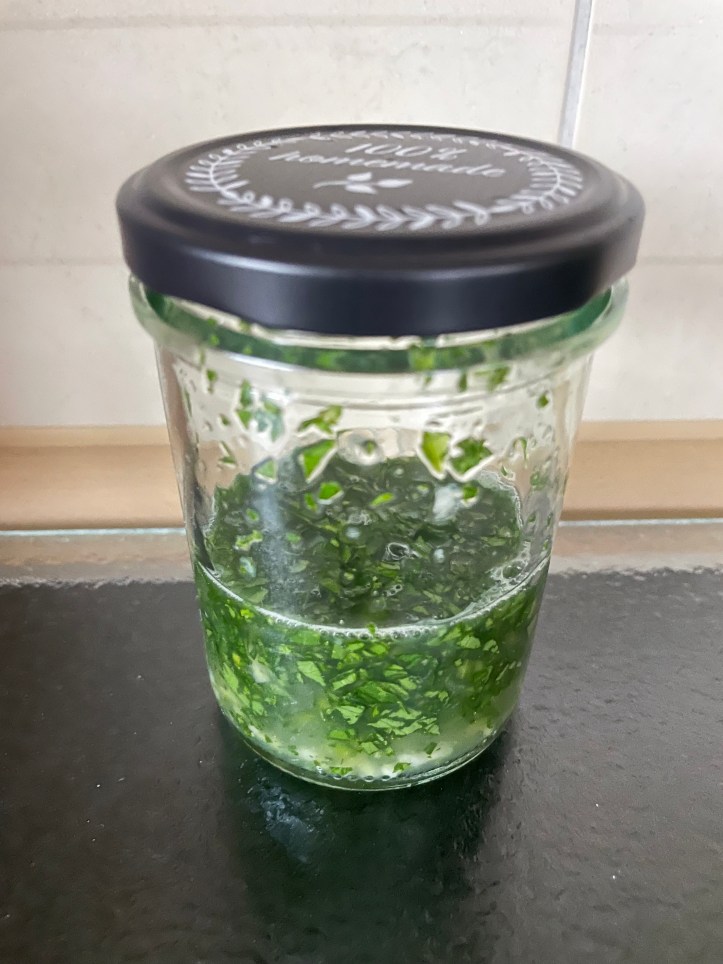 Eine Geschmacksbombe aus Petersilie, grüner Chilischote, Knoblauch, Zitronensaft und Weißweinessig – zum Auberginen-Kichererbsen-Topf ein Muss, aber auch auf anderem Gemüse ein Geschmacksbooster!