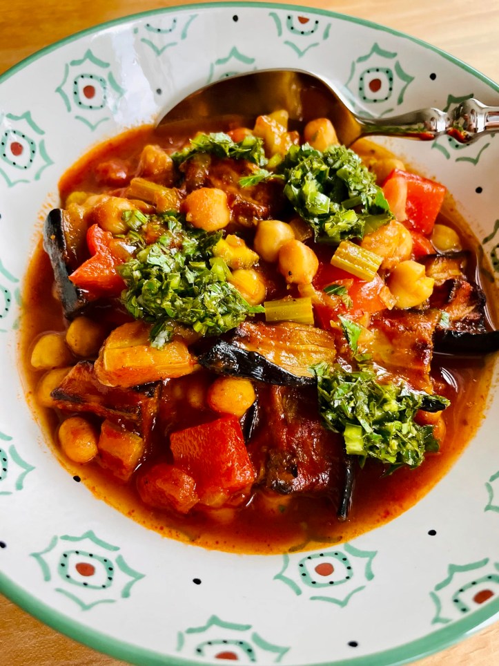 Die Auberginenwürfel werden erst im Ofen gebacken. Währenddessen schmörgelt man Zwiebeln, dann rote Paprika und Staudensellerie an und würzt mit reichlich Knoblauch und einer tollen Gewürzmischung aus Kreuzkümmel, Koriander, Zimt, Aleppo Chili, Paprika, Piment und Kurkuma. Wenn alles toll duftet, kommen Tomaten, Kichererbsen und die gebackenen Auberginen hinzu und alles darf sich bei geschlossenem Deckel gut auf dem Herd verbinden.
