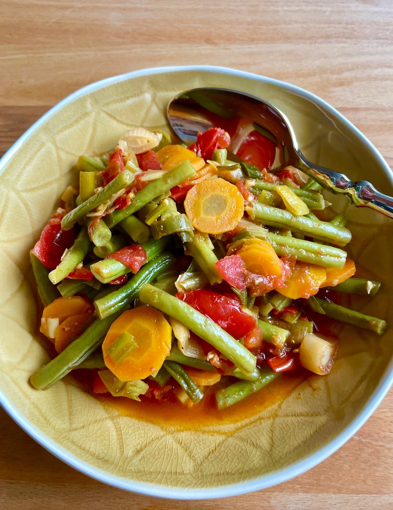 Ein ganz einfacher Gemüseeintopf mit viel Olivenöl, Knoblauch, etwas Chili und Kreuzkümmel. Er kann warm oder kalt gegessen werden – das macht ihn zum Allrounder auf dem Küchentisch. Und es schmeckt immer fantastisch!