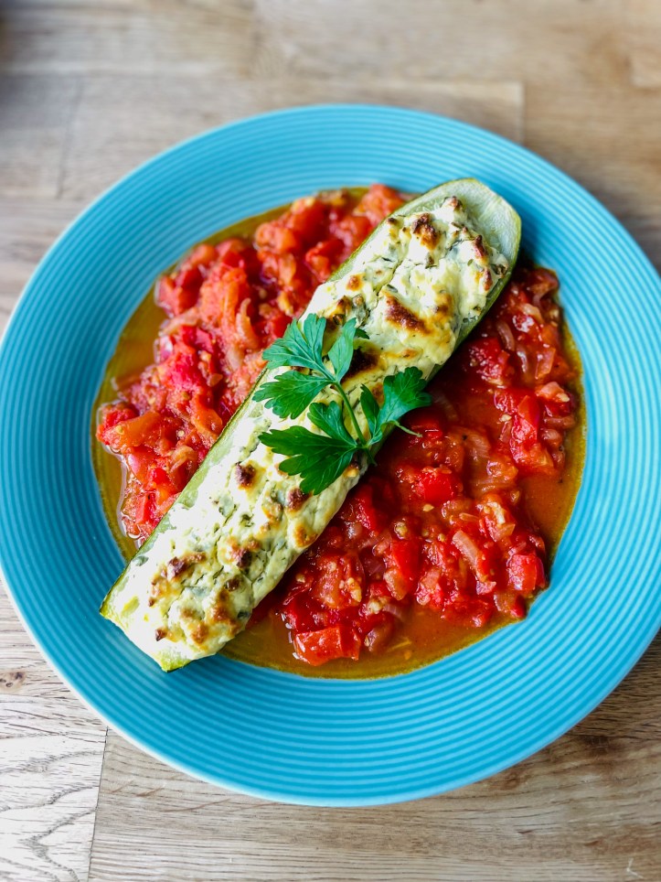 , Salz und Pfeffer. Fertig und total lecker mit schönen Sommertomaten.Die Zucchini werden mit einer Füllung aus Ricotta, Parmesan, Eigelb, Basilikum, Petersilie und abgeriebener Zitronenschale im Ofen gebacken. Echt klasse!! Und fix gemacht. Hier gab es noch Reis dazu.