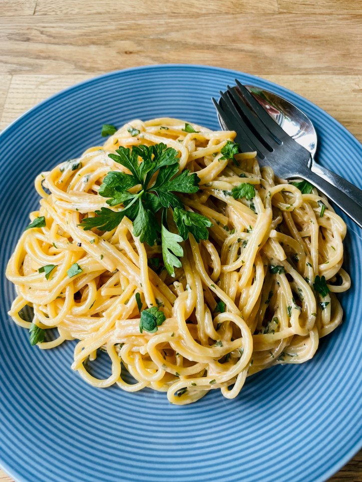 Die Sahne darf um die Hälfte einkochen, dann kommen Petersilie und etwas Tomatenpüree dazu, Herd ausschalten und reichlich Parmesan und Pfeffer dazugeben und ggf. noch etwas Salz. Also eine Variante von Cacio e Pepe. Und was für eine feine (aber auch sehr mächtige).Im Buch wird die Pasta auch selbst gemacht – hier gab es gekaufte.