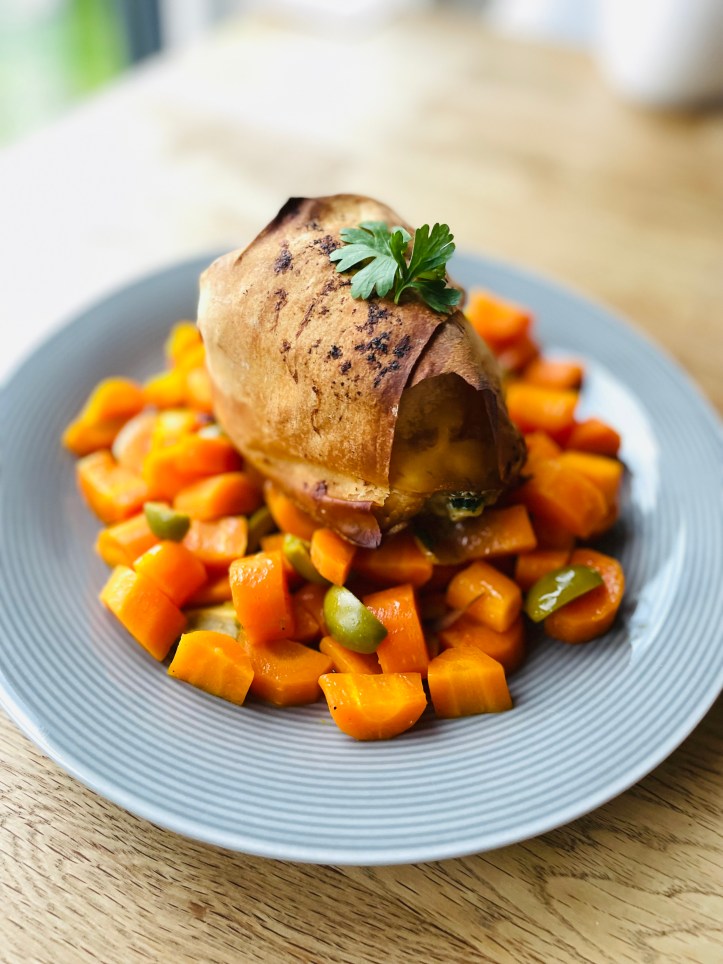 Eigentlich soll der in Filoteig verpackte und in frischen Kräutern (Petersilie, Majoran, Thymian) gewendete Käse auf Wintergemüse serviert werden (Wirsing und Lauch), aber alternativ waren auch die Honigkarotten benannt, die in Butter angeschwitzt, mit Honig verfeinert und in Orangensaft gekocht werden, bevor am Ende Oliven dazu kommen.