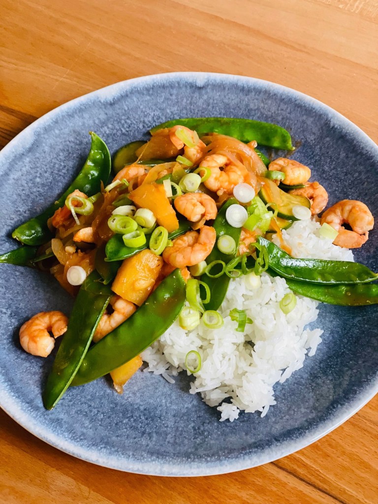 Hier werden die Garnelen mit Knoblauch gebraten, dann zur Seite gestellt und Zwiebeln, Zuckerschoten, Gurke und Ananas kommen in den Wok. Zum Schluss kommt die Sauce an das Gemüse. Sie besteht aus Sojasauce, Orangensaft, Zucker, Tomatenketchup, Fischsauce und Wasser. Die Garnelen dürfen kurz noch einmal richtig warm darin werden, bevor mit Jasminreis und Frühlingszwiebeln serviert wird. Yummy!!!