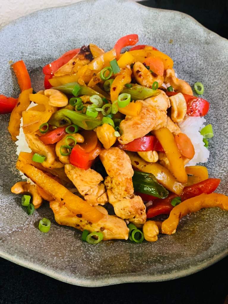 Cashews, Hähnchen und Paprika gehen immer gut zusammen, hier kommen noch Möhre, Frühlingszwiebel und Pilze dazu.  In die Sauce kommt Nam Prik Pao, die thailändische Chilipaste, Austernsauce, Fischsauce und etwas Zucker sowie Hühnerbrühe. Ganz schnell gemacht und einfach lecker, mit angenehmer Schärfe und viel Würze. Köstlich.😋