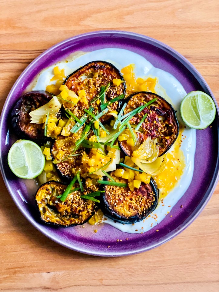 Die fertigen Auberginen werden auf mit Limettenschale, Knoblauch und Salz gewürztem Joghurt angerichtet. Die Sauce hinüber träufeln und als Topping kommt noch eine Mischung aus geröstetem Sesam, Curry und Salz obenauf. Ein paar Streifen Frühlingszwiebelgrün und Limettensaft runden das Aromenspektakel ab.